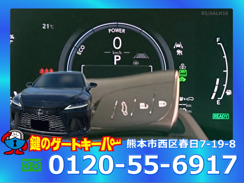 今回のお車はレクサスRX450hで、キー紛失からの作製依頼を受けて行ってまいりました。車のバッテリーが上がっていたためジャンピングをしなくてはいけないのですが、ラゲッジルームにバッテリーがあるのでリヤハッチを開け、ケーブルを繋ぐ前にクラクションが鳴らない様に作業をしました。しかし繋いだ途端にセキュリティーアラーム(電子音)が鳴り出しました。なんてセキュリティーなんだ・・・ ホーンよりまだ音小さめなのでアラームは鳴りっぱなしで作業をしました。 日中で良かったなと感じた案件でした。
