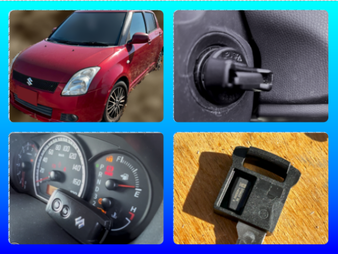 スズキ・スイフトのカギ作製 画像のスマートキーでエンジンをかけるプッシュスタート車・つまみを回すツイストノブ車・キーを差して回すタイプのイモビライザー搭載車に対応いたします。