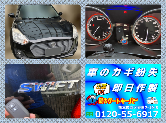 こんにちは鍵のゲートキーパーです。スイフトのキーを失くしたという事で作製依頼のお電話を頂きました。ほとんどの車種に対応ができる様にしておりますのでキーの在庫があれば即日の作製が可能です。このスイフトは1時間くらいで作業が完了。ご依頼ありがとうございました。