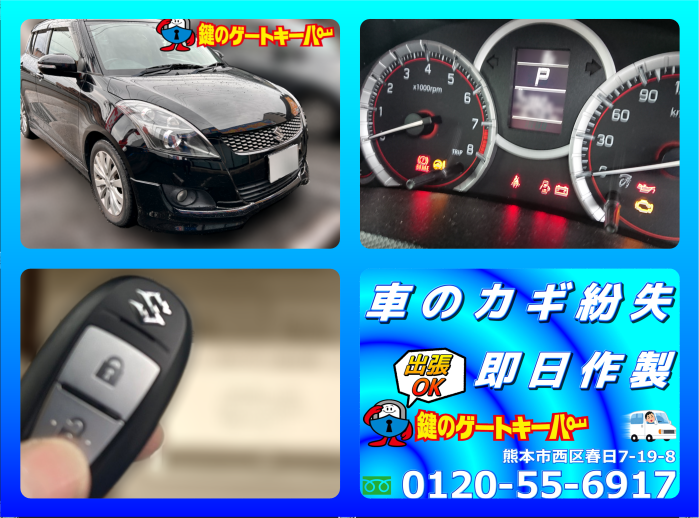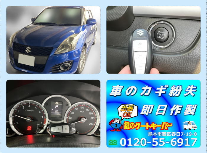こんにちは鍵のゲートキーパーです。今回のお車はスイフトのスマートキー作製です。通常修理でメーカーに運んでもらうと修理費用が10万円ほどかかるそうですが、当店の場合、スタッフが出張しますので車はそのまま、現地で動く様に修理(キー作製とスマートキーのプログラムをします)します。費用も半分ていど しかも早いです。キーを失くした時はお問合せください。ご依頼ありがとうございました。
